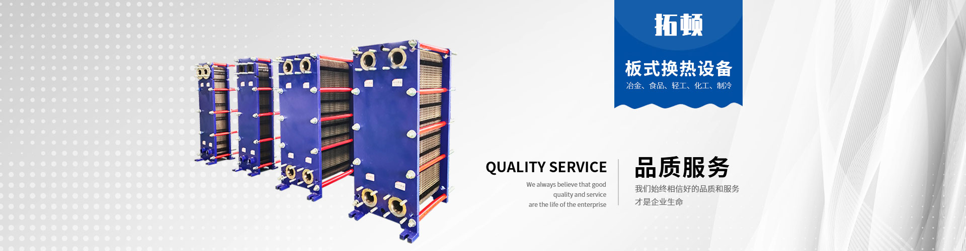 經過持續努力,拓頓取得了質量、健康和環境體系的“三標一體”認證、美國ASME 認證。制造許可證等體系認證; 公司以8大族群30余種換熱產品為載體, 為化工、冶金、供熱、機械油冷、醫藥、造紙、輕紡、船舶、石油、電力、集中供暖、空調制冷、食品飲料、海水淡化、海水養殖,生物質能分布式能源等行業提供個性化、專業化的解決方案用于加熱、冷卻、蒸發、冷凝、殺菌毒、余熱回收等。